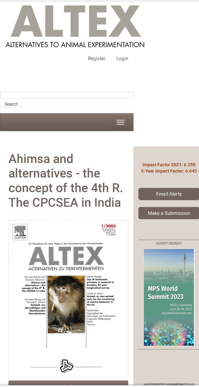 1. She pioneered and introduced the “THE SCIENCE OF ALTERNATIVES TO ANIMALS IN RESEARCH/EDUCATION MOVEMENT” in INDIA to promote the universal concept of 3Rs (Replacement , Reduction and Refinement of Russel and Burch) by organizing the first ever conference on alternatives in New Delhi in 2003, under the aegis of CPCSEA(Committee for the Purpose of Control and Supervision of Experiments on Animals), Ministry of Environment & Forests, GOI, when working as Expert Consultant with the CPCSEA. Experts from the best platforms of alternatives from the USA and Europe were invited to address a gathering of close to 500 scientists and students. Hence the first seed was sown to better laboratory animal welfare in India.