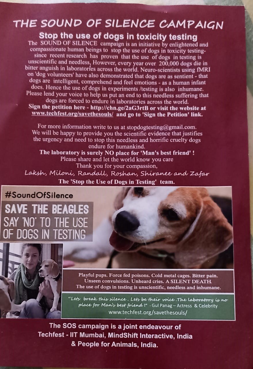 6. She launched a campaign that she called ‘SOUND OF SILENCE’ Campaign at the TECHFEST 2016 in IIT Mumbai, with Gul Panag amidst over 1000 IITians from all over India – to create awareness in the cruelty involved in the silent suffering of dogs and other animals in toxicity testing and with the goal to one day stop all use of dogs / other animals in toxicity testing.